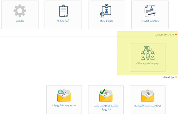هر عضو بعد از ورود به فرم ترفیع سالانه می بایست نسبت به بررسی و تکمیل دقیق کلیه آیتم ها اقدام نماید. دقت نمایید مسئولیت تمامی اطلاعات وارد شده و مدارک ارسال بر عهده عضو خواهد بود.
