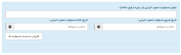 یکی از قسمت های فرم ترفیع سالانه، تکمیل سوابق "مسئولیت های مصوب اجرایی (در دوره ترفیع سالانه)" می باشد. اعضای محترم در صورتی که طی دوره مورد درخواست مسئولیت اجرایی داشته باشند، می بایست عنوان و زمان شروع و پایان هر مسئولیت را وارد نموده و گزینه "افزودن به لیست مسئولیت ها" را کلیک نمایند. بدیهی است در صورتی که مسئولیت اجرایی طی دوره مورد درخواست جهت ترفیع نداشته باشید، نیاز به تکمیل این قسمت وجود ندارد.